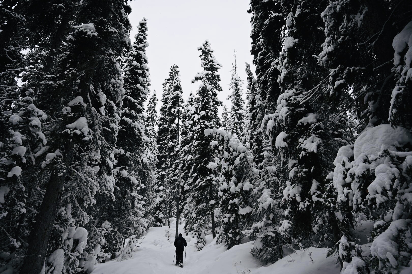 We woke up on Rob’s birthday to another pow-day, this time with a bonus bluebird sky. We headed into Kananaskis for an epic snowshoe to Troll Falls.