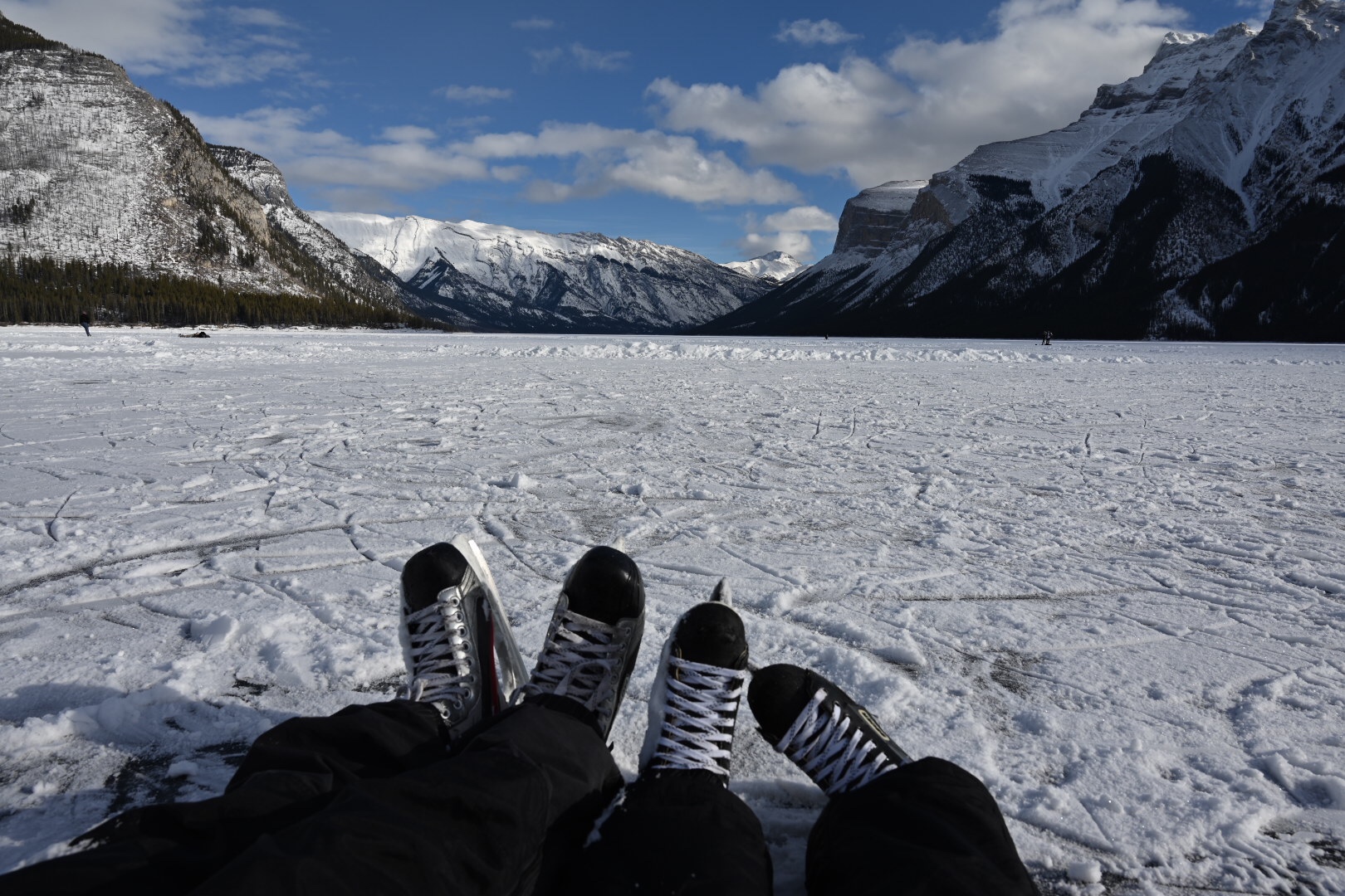 We chased the sunshine to Lake Minnewanka and checked the lake skate off the bucket list with unparalleled views and only a handful of other people.