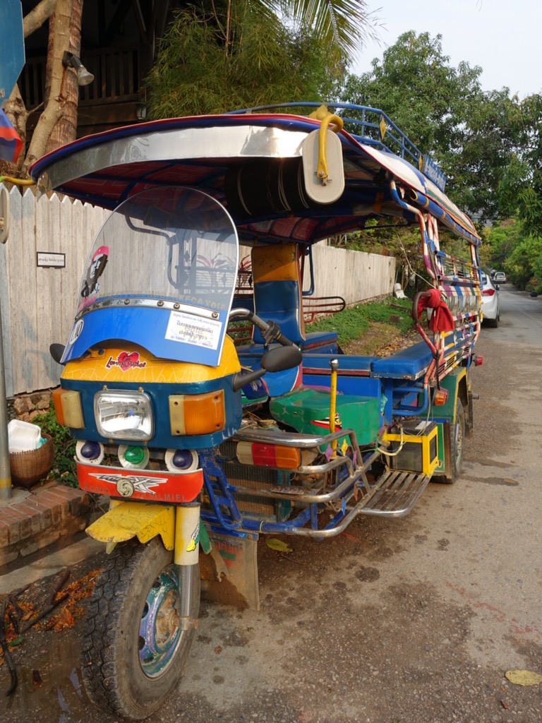 It is in the same vein of slow travel that we had decided to take the ‘slow boat’ from Luang Prabang to Chiang Mai, Thailand. We are picked up by the slowest tuk tuk in Laos and delivered to the boat dock about 10kms away. There we board our long, narrow, wooden boat that will take us upstream on the mighty Mekong River to the Thai border. The seats in the boat are actually car seats. They are filled by about 80 people sleeping, daydreaming, and snacking. Check out the size of our food bag!